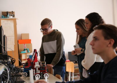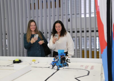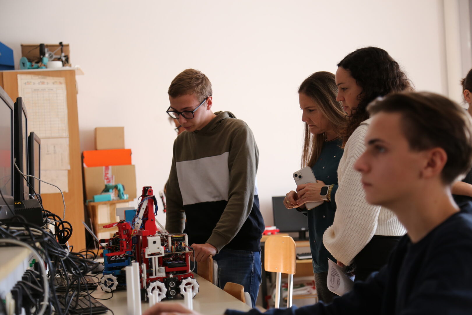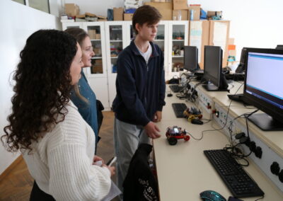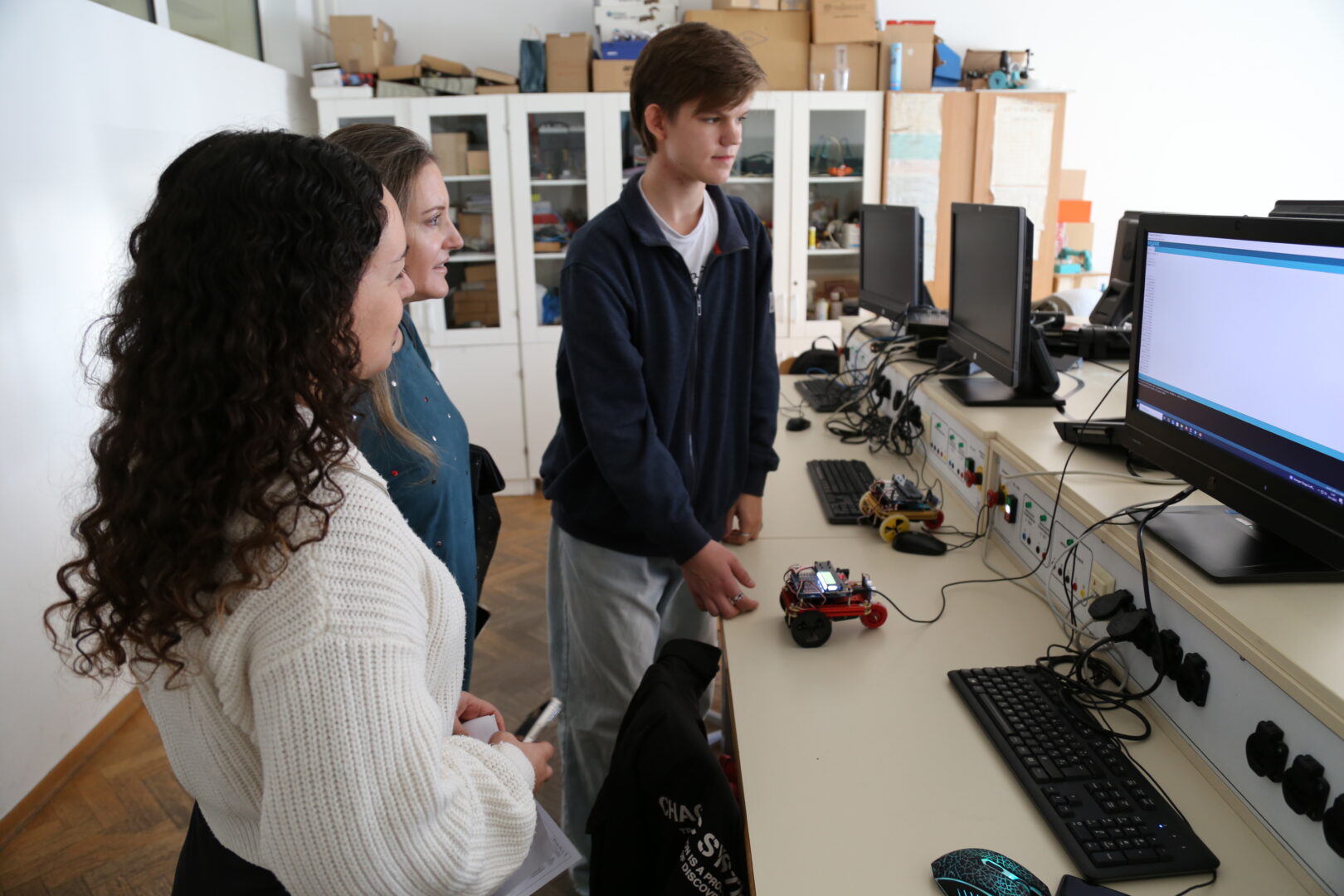 U petak, 14. studenog, profesorice su posjetile nastavu predmeta Digitalna logika (razred 2.c, prof. Skuliber), gdje su pratile način izvođenja vježbe integriranih digitalnih sklopova. Profesor Korčanin te učenici koji sudjeluju u izvannastavnoj aktivnosti Robotika demonstrirali su gošćama faze priprema za natjecanje, način izrade robota te nekoliko pripremnih vježbi izvođenja zadataka.