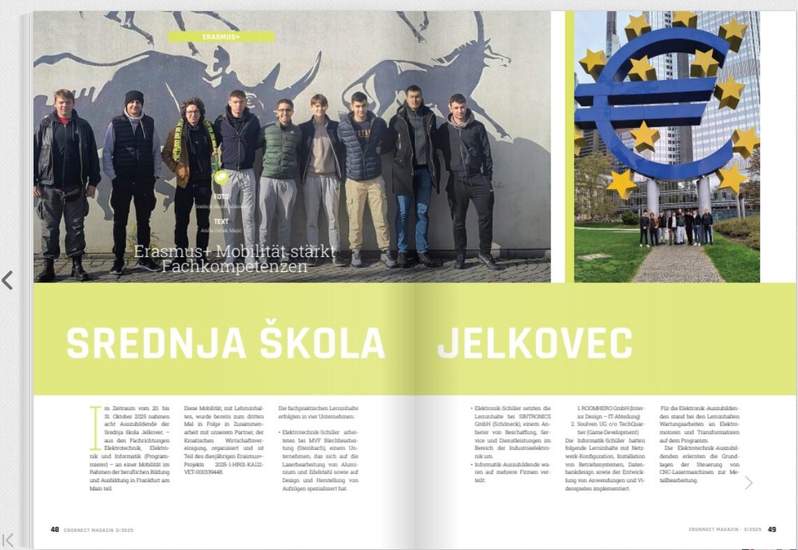 Kratkoročna mobilnost učenika Srednje škole Jelkovec u sklopu projekta 2025-1-HR01-KA121-VET-000339448 predstavljena je u časopisu Cronnect, koji uređuje naš partner, Hrvatski gospodarski savez.
