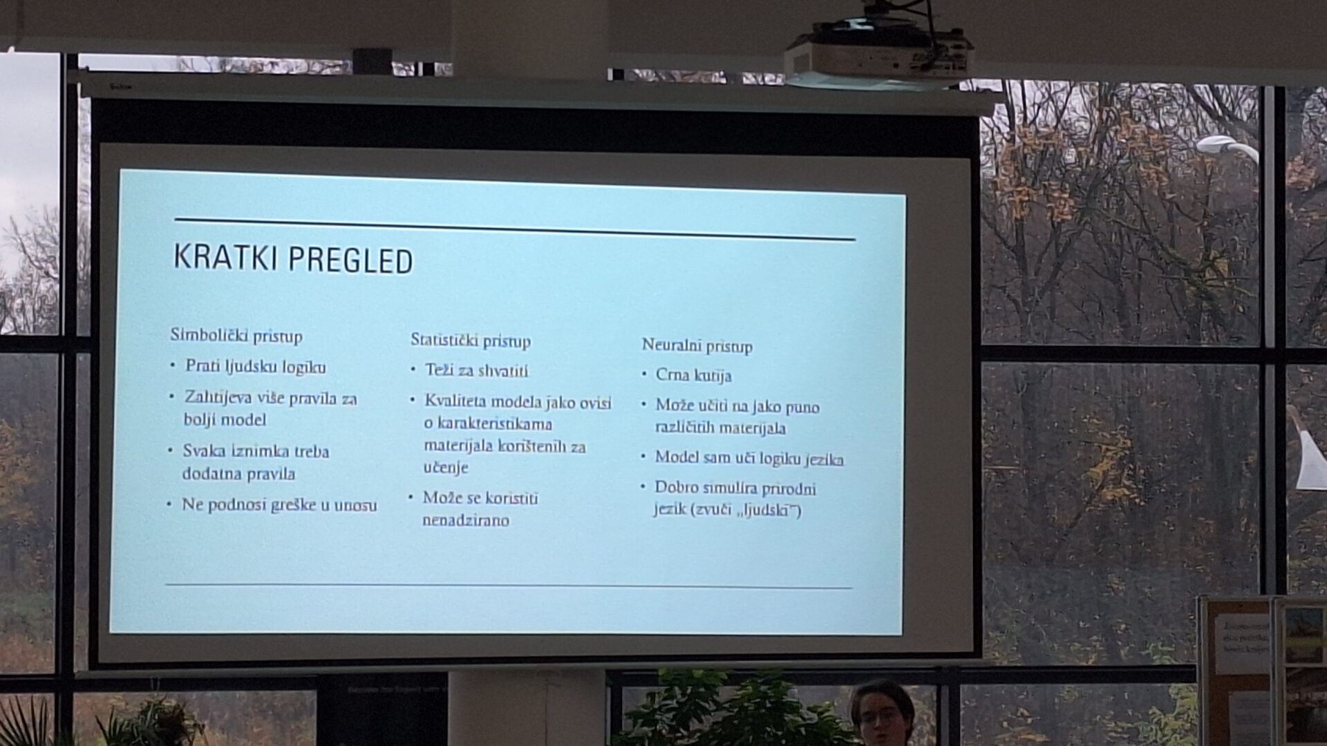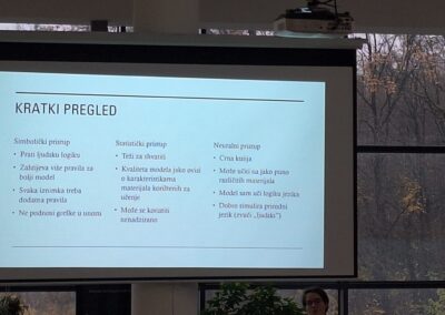 Predavačica je dala povijesni pregled te objasnila sve značajke simboličkog, statističkog i neuralnog pristupa obradi prirodnog jezika.
