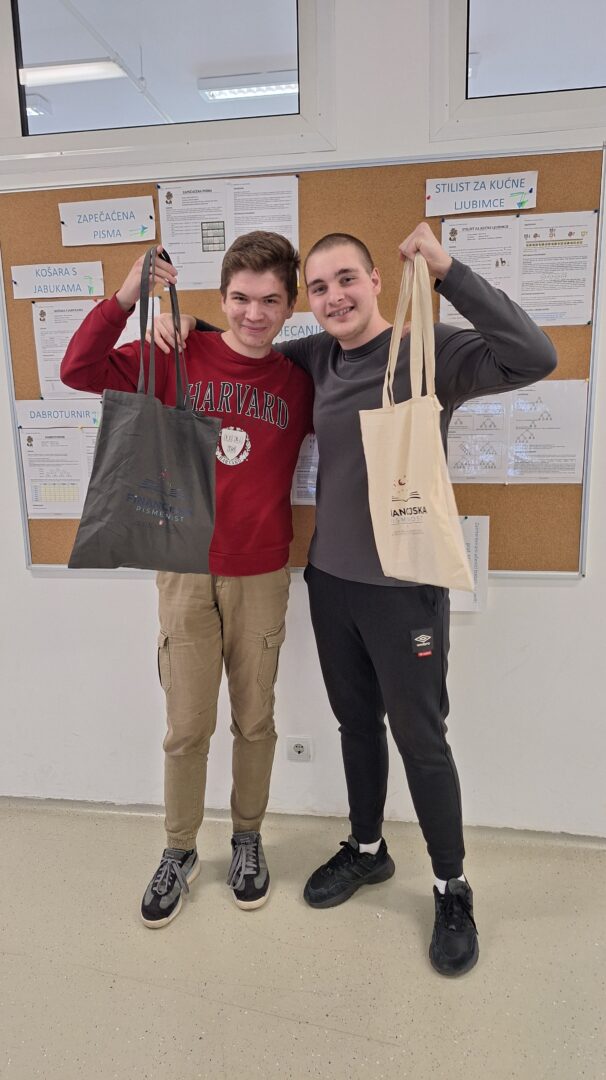 Hrvatska agencija za nadzor financijskih usluga (Hanfa) u veljači je raspisala nagradni natječaj za učenike srednjih škola. Tema ovogodišnjeg natječaja bila je prepoznavanje financijskih i investicijskih prijevara, situacija koje često izgledaju kao brza prilika za zaradu, ali u stvarnosti kriju rizike i moguće gubitke. Zadatak je bio osmisliti kratki videorad u kojem će učenici izmišljenu prijevaru (scenarij ili priču) prikazati na način da gledatelji mogu prepoznati znakove upozorenja i naučiti kako se zaštititi. Pobjedu je odnijela Srednja škola Novska. Pobjednički video pogledajte na poveznici: https://www.youtube.com/watch?v=2O87-RVQ3T4. Učenici 3. e razreda Karlo Kolak i Petar Danijel Isić napravili su video o debitnim karticama te važnosti čuvanja sigurnosnih brojeva na poleđini kartica u tajnosti. Naši su učenici dobili utješnu nagradu.