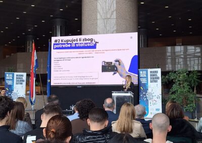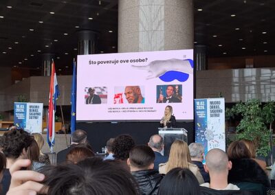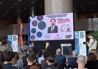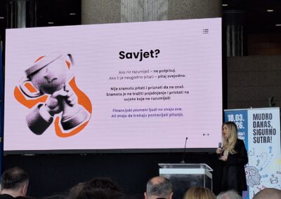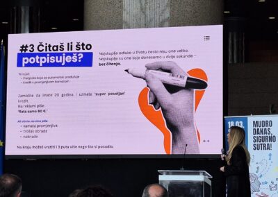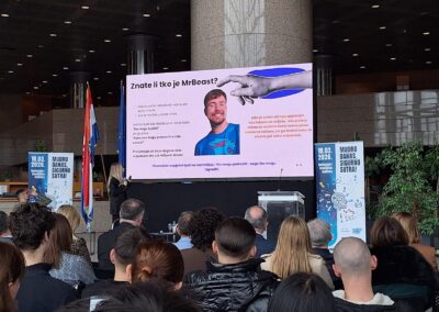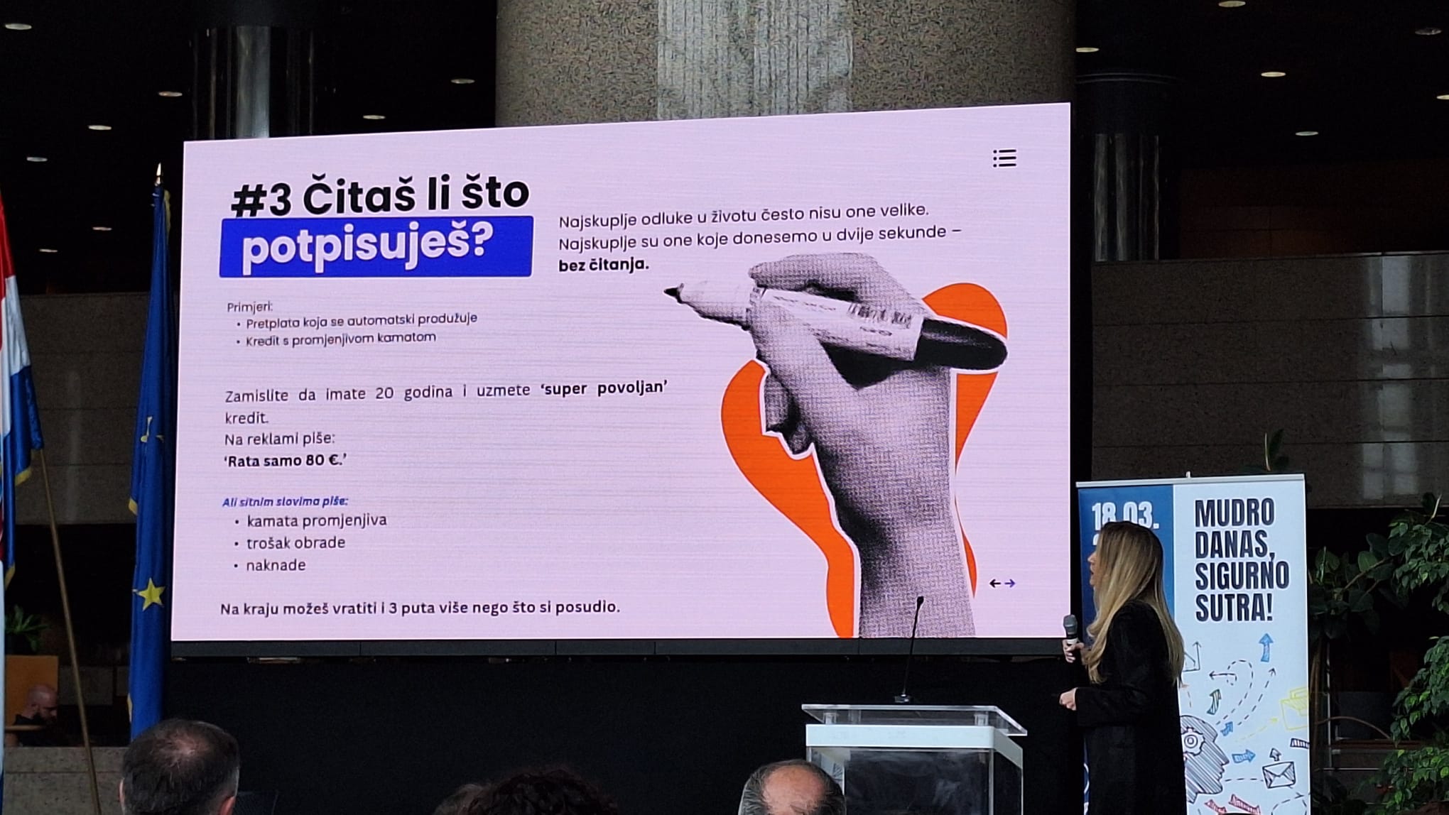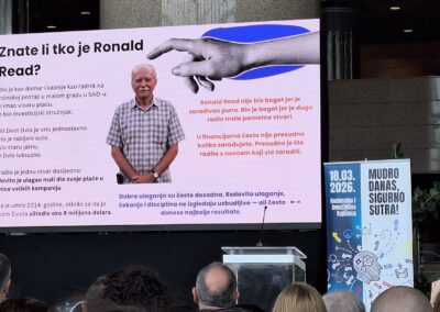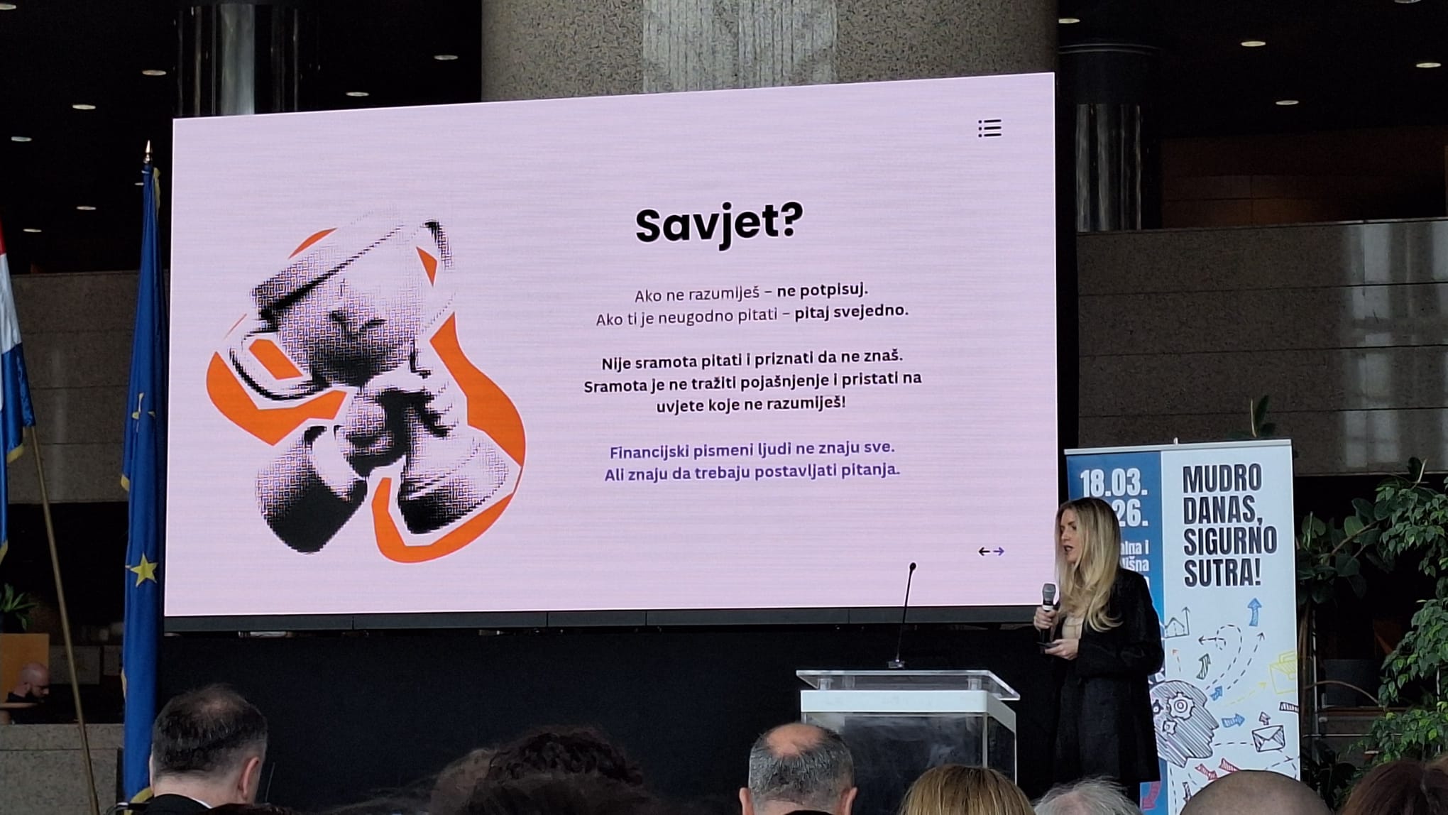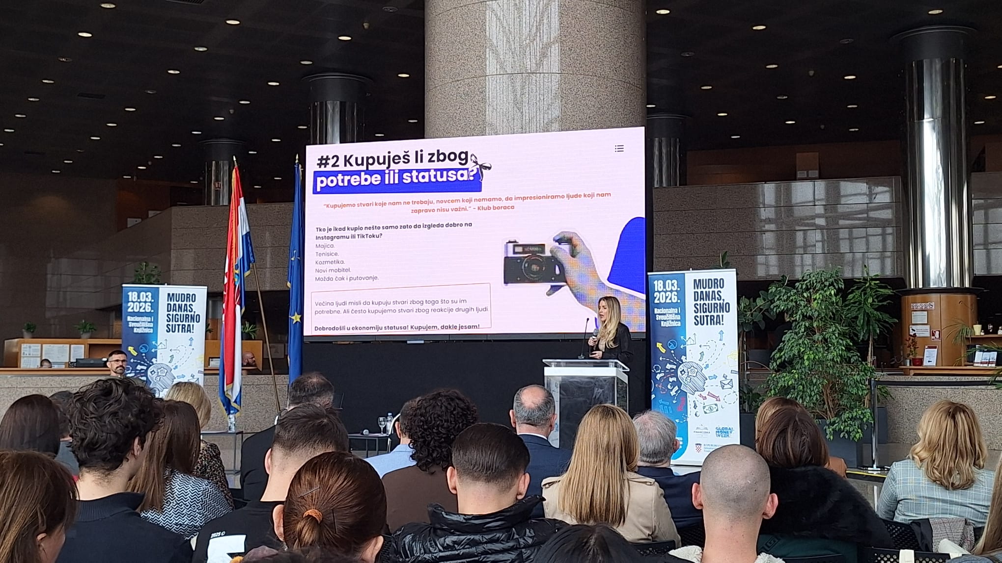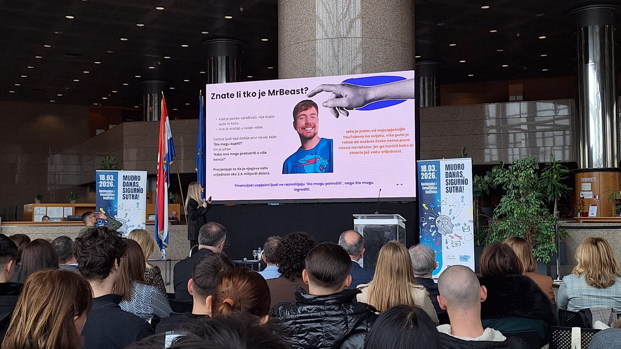 U srijedu smo bili u Nacionalnoj i sveučilišnoj knjižnici na konferenciji pod nazivom „Mudro danas, sigurno sutra!“ koju je organiziralo Ministarstvo financija. Pozdravni govor održao je ministar financija, a onda su ga pitanjima izrešetali ambasadori financijske pismenosti Toni Milun i Dajana Barbić. Ambasadori financijske pismenosti dotaknuli su se različitih tema, od štednje do ulaganja. Događanje je završilo kvizom za učenike u kojem su mogli osvojiti različite nagrade. Sve je prošlo u veselom tonu uz voditelja Franu Ridjana uvijek spremnog na šalu i zabavu.